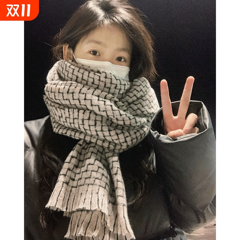 围巾冬季女款高级感黑白格子百搭加厚保暖防寒学生复古流苏围脖潮