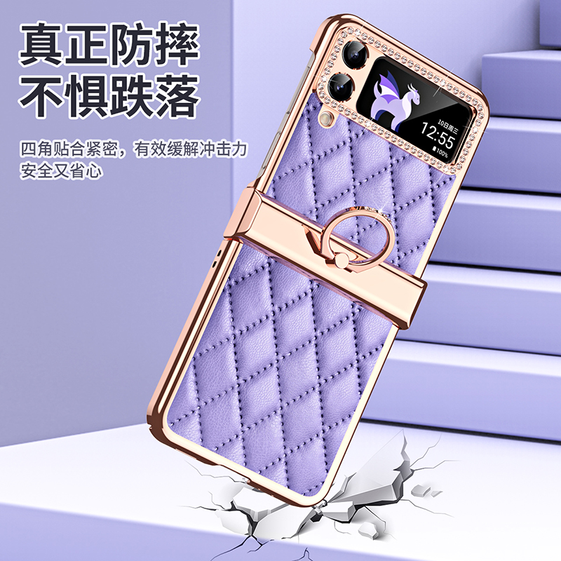 适用于 三星flip4手机壳钻石纹小香风侧边铰链全包filp4指