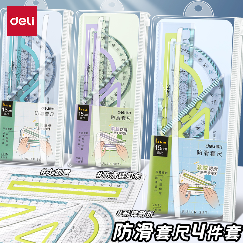 得力套尺尺子套装四件套小学生专用防断硬尺画图透明三角板儿童折不断
