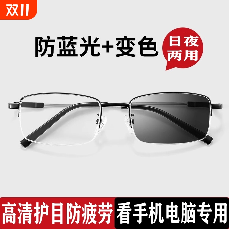 感光男女防蓝光辐射抗疲劳平光眼镜半框护眼防近视无度数变色两用