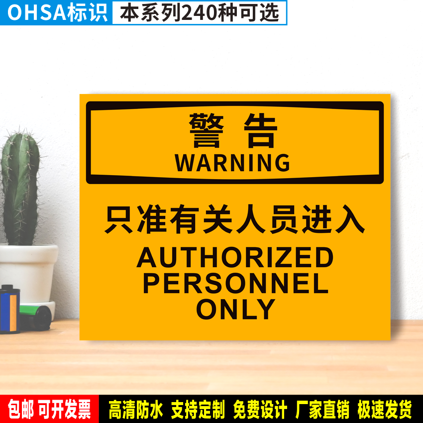 只准有关人员进入 定制防水粘贴纸PVC板铝牌车间验厂OHSA警告