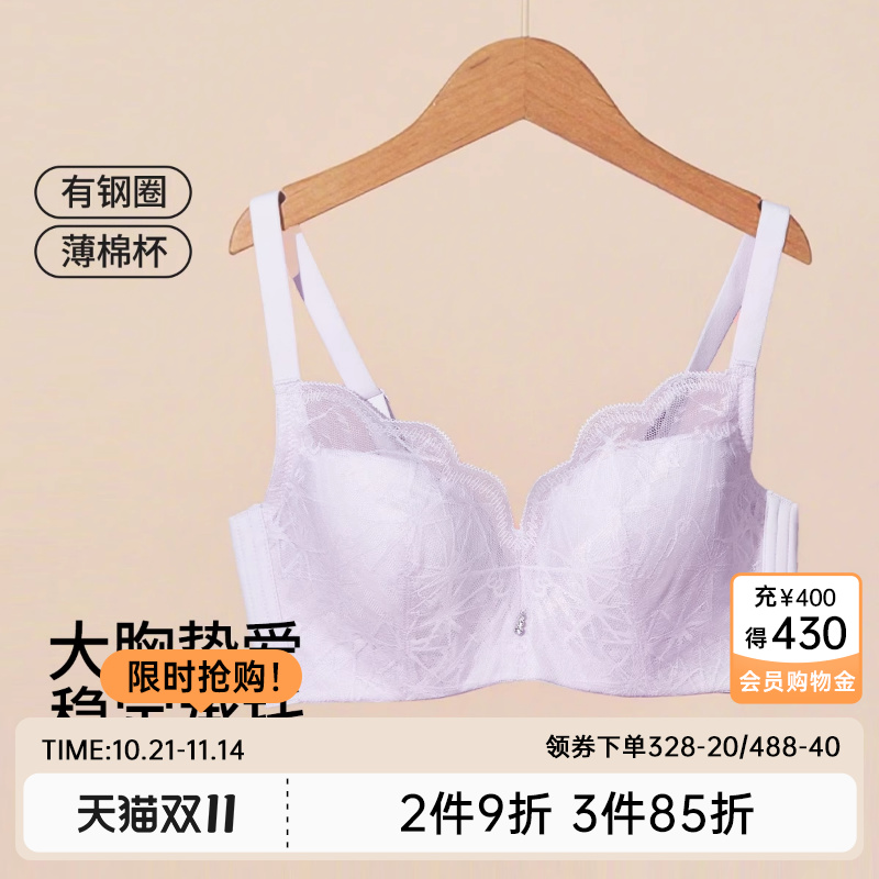 茜施尔新款性感蕾丝内衣女薄杯有钢圈大胸显小防下垂收副乳文胸S