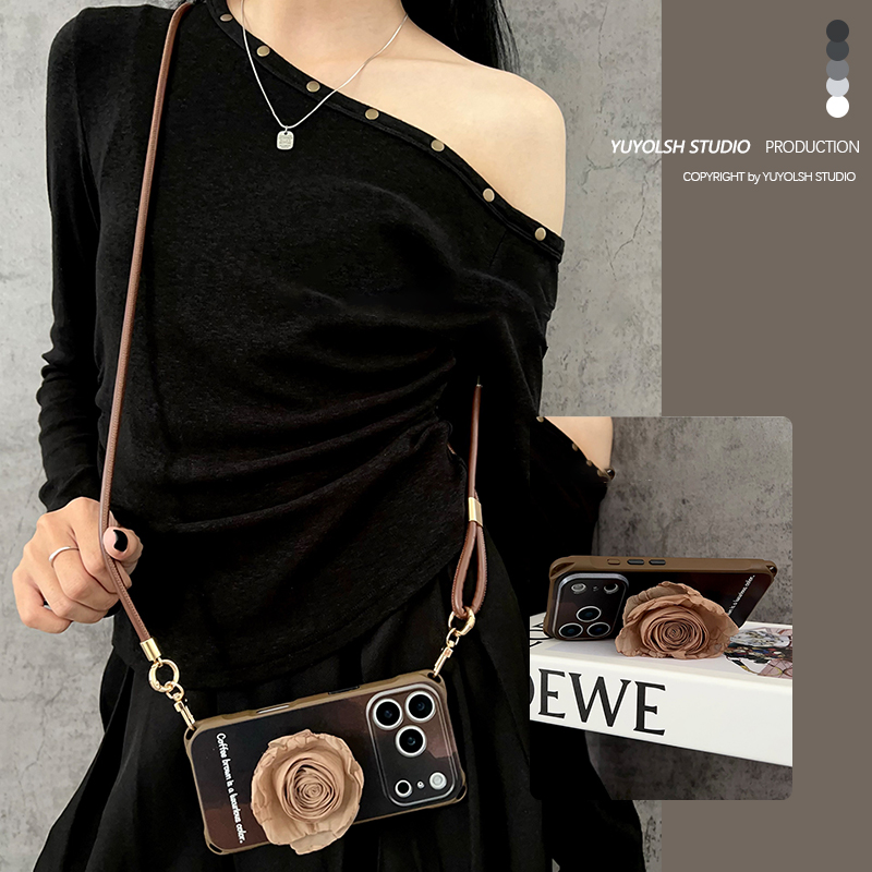 咖啡晕染玫瑰支架手机壳斜挎挂绳