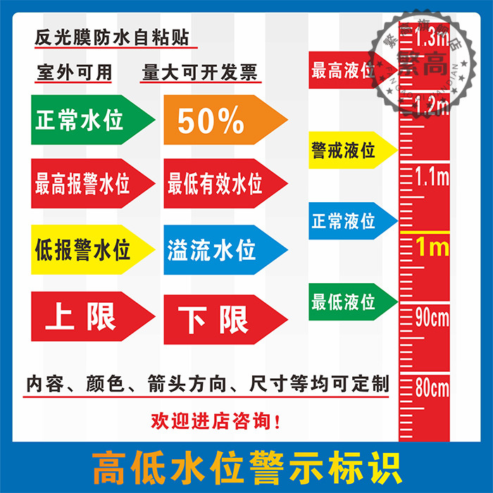 热销液位正常水位警戒溢流液位上限下限标识贴纸防水防油反光膜贴