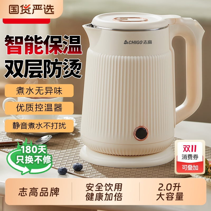 志高电热水壶2.0升大容量双层防烫食品级不锈钢长效保温电热水壶