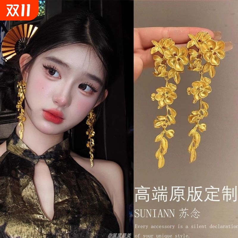 轻奢夸张新中式花朵流苏耳环女金色高级感气质复古旗袍耳饰品耳钉