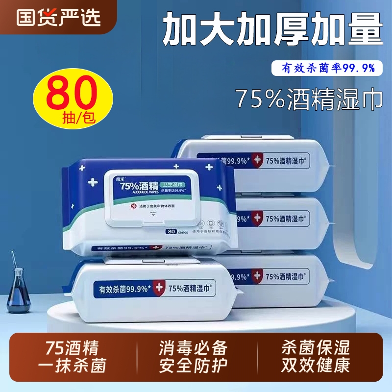 含75度酒精消毒湿巾大包装80抽大片加厚学校家用卫生杀菌湿纸