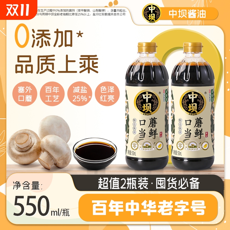 中坝口蘑当鲜酱油550ml*2瓶家用酱油酿造老字号中华老抽减盐头