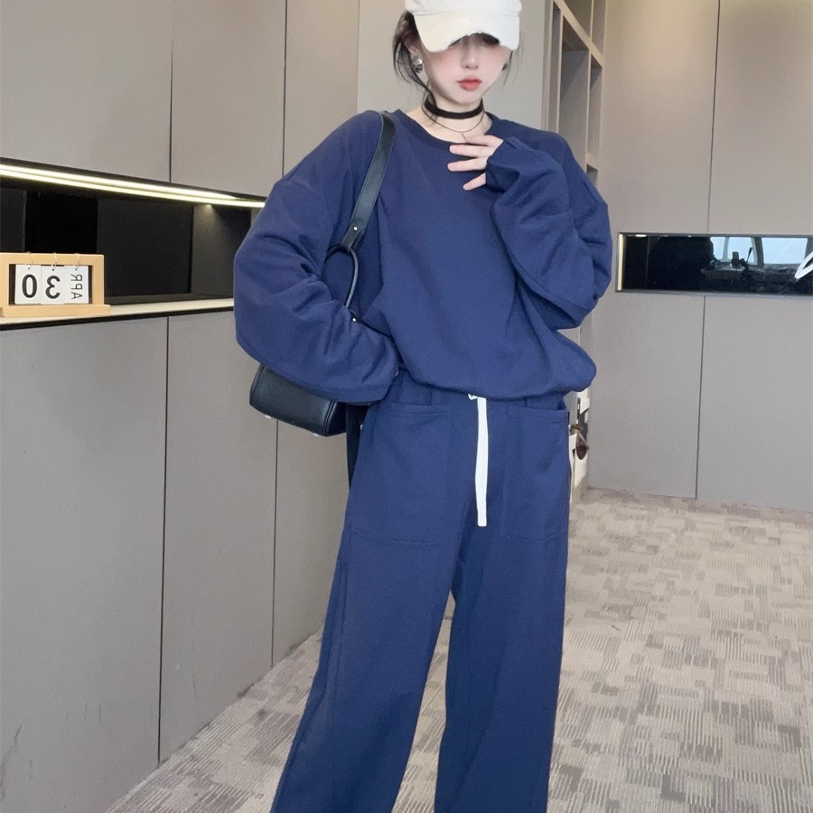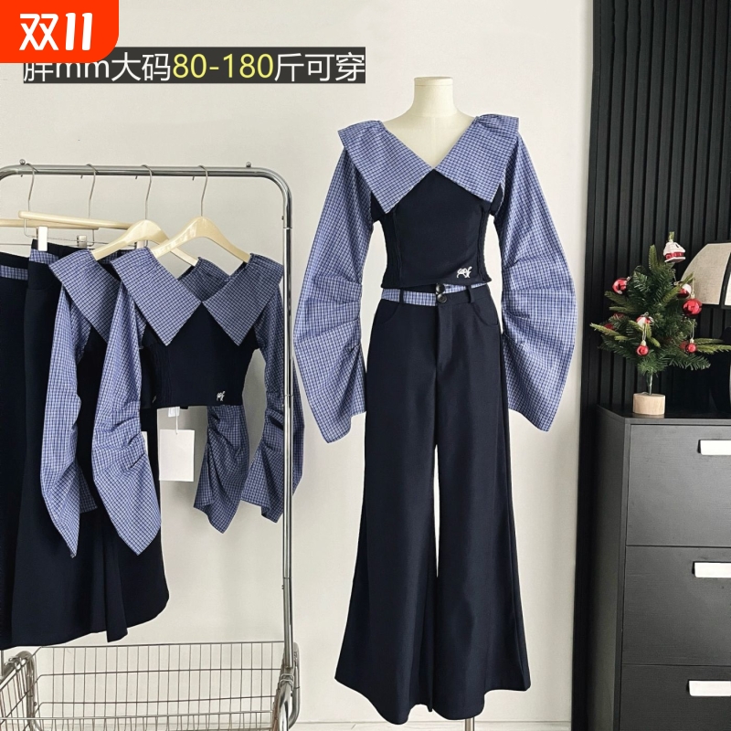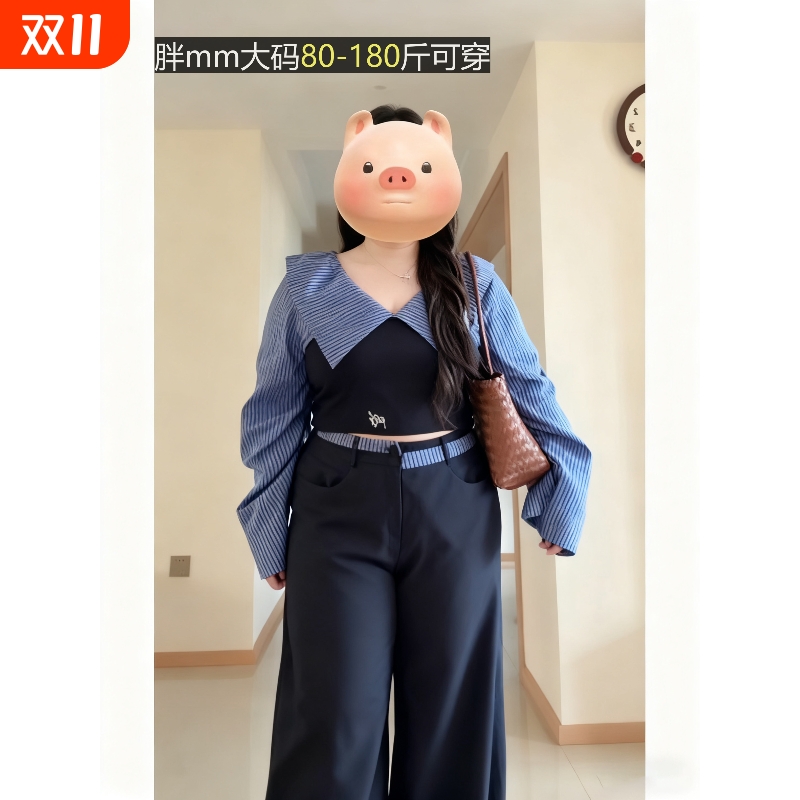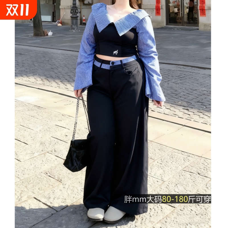 大码胖mm复古高腰阔腿休闲裤设计感撞色拼接短款上衣两件套女春季
