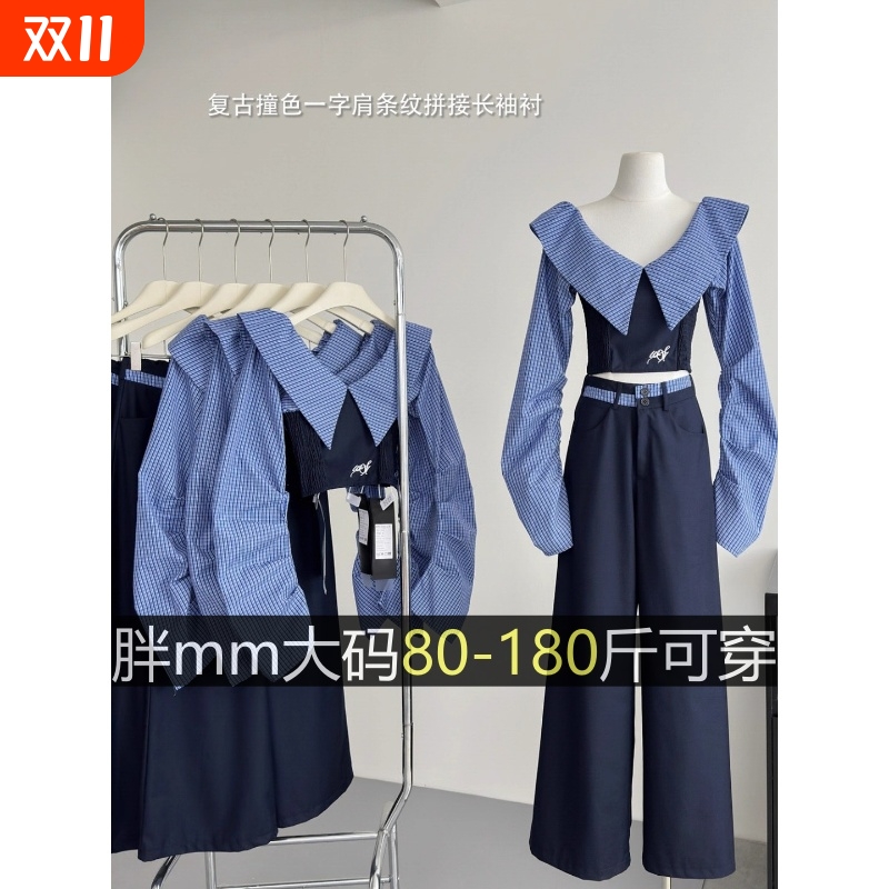 设计感一字肩条纹拼接衬衫上衣女春季高腰阔腿裤两件套大码气质潮