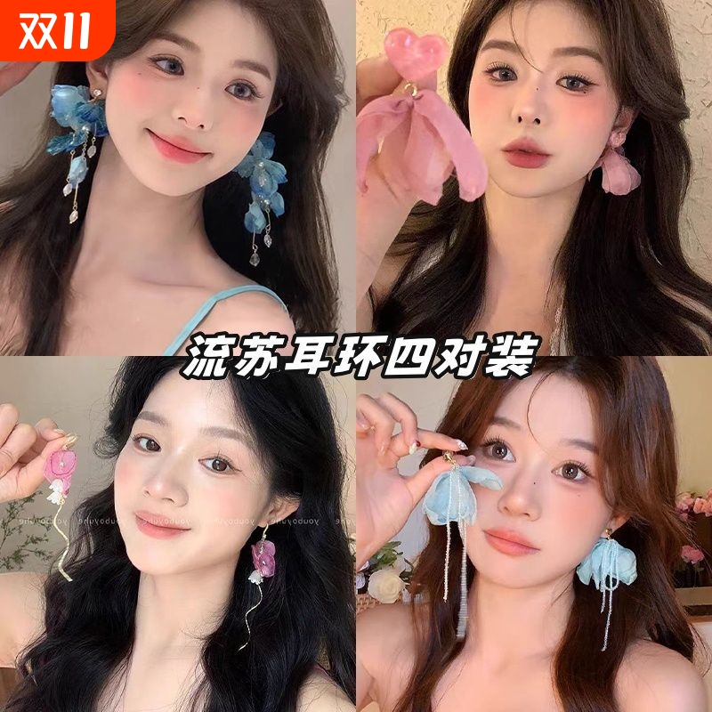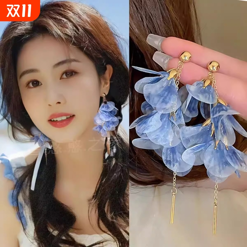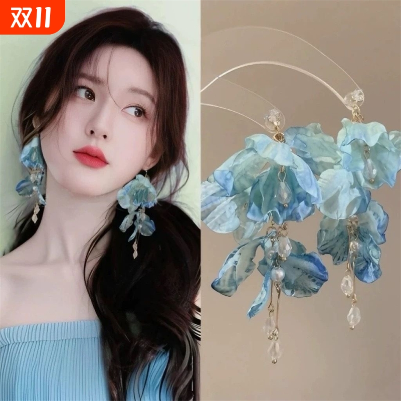 白鹿同款耳环蓝色花瓣耳饰超仙耳钉耳坠2025春夏新款旅游饰品女