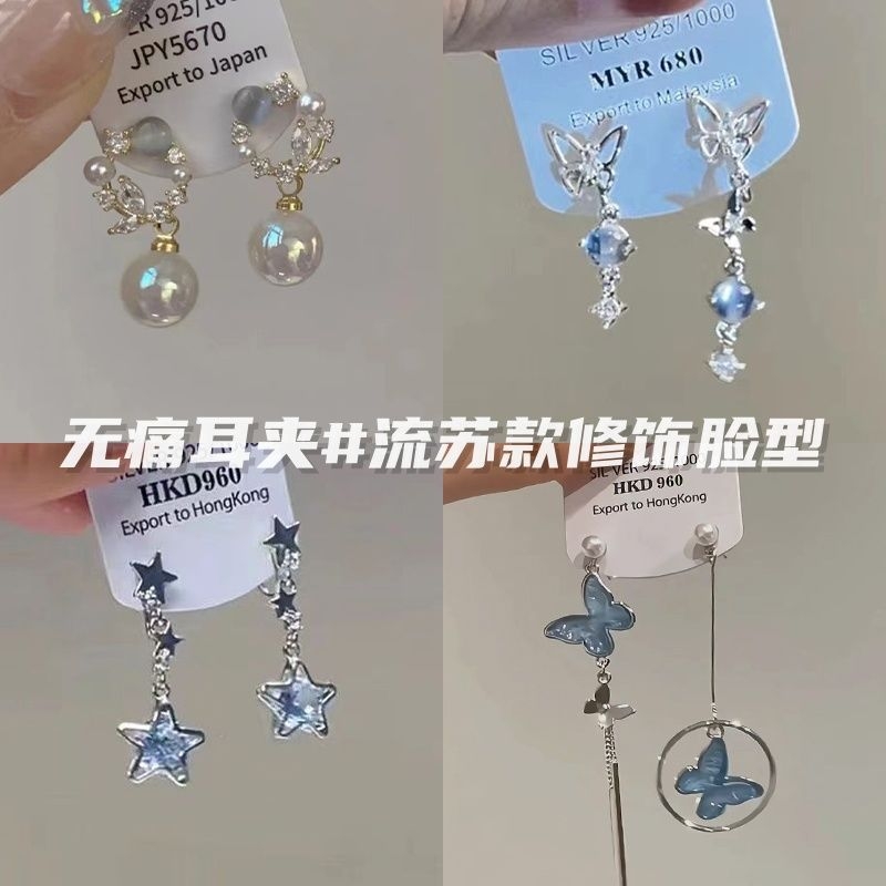 赵露思同款耳环蓝色花朵布艺旅游度假耳饰耳钉耳夹无耳洞2025春夏