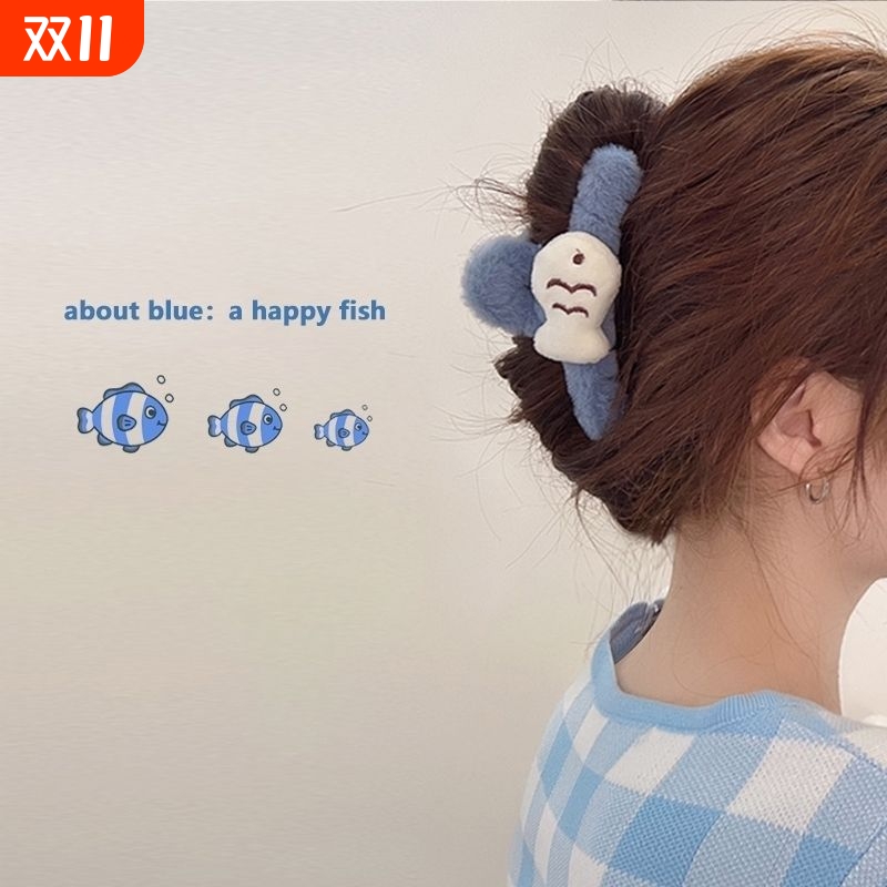 蓝色小鱼毛绒发夹女后脑勺可爱鲨鱼夹大号抓夹网红2024年夹子头饰