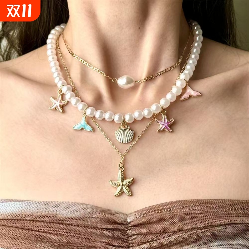 夏日海星多层贝壳流苏项链彩色新款鱼尾叠戴锁骨链高级感脖颈链