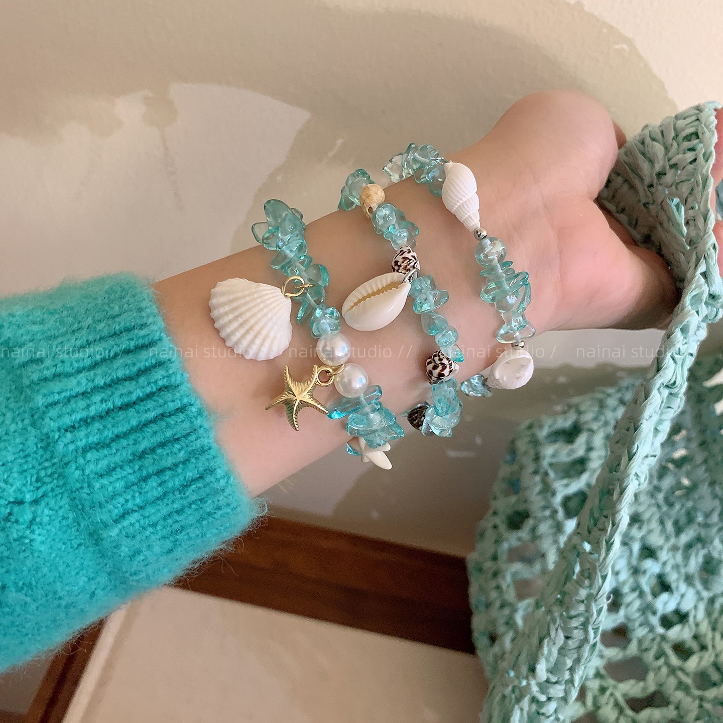 海星贝壳手链~蓝色小碎石海边度假风2025夏季新款手串手饰配饰女