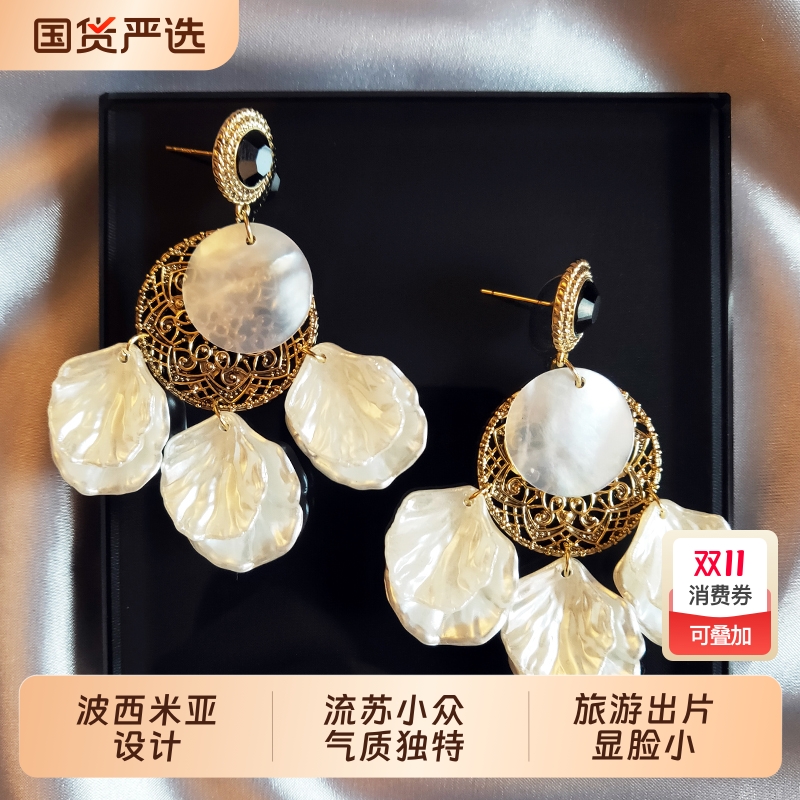 即幻波西米亚复古风气质贝壳耳环法式长款流苏高级感大气夸张耳饰