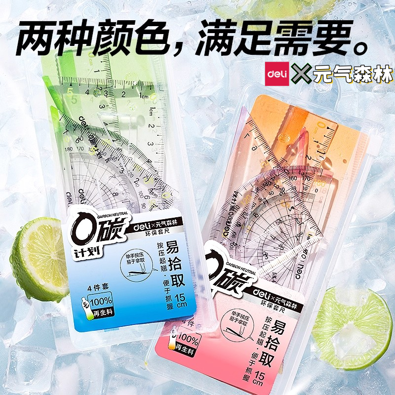 得力x元气森林环保套尺学生不费眼大数字尺子四件套三角尺直尺格尺量