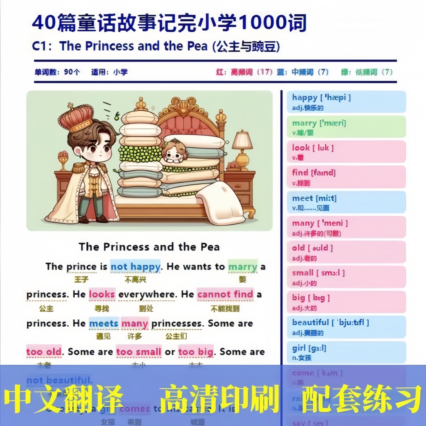 40篇童话故事英语晨读小学1000核心词汇语法运用中英文互译默写