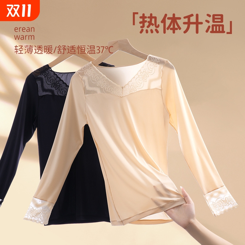 超薄秋冬保暖内衣女士秋衣玻尿酸美肤衣高弹肌底衣蕾丝打底衫套装