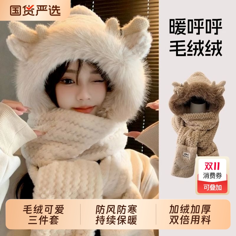 可爱鹿角帽子三件套围巾一体冬季手套围脖加厚连帽保暖毛绒骑车女