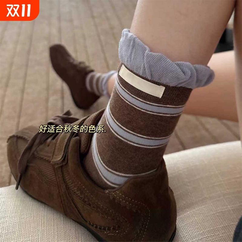 无骨条纹撞色双罗口布标字母ins潮袜韩系泡泡口棉质百搭中筒袜子