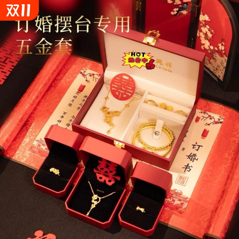 假三金订婚摆台道具仿真五金套装结婚首饰一套婚礼沙金手镯假黄金
