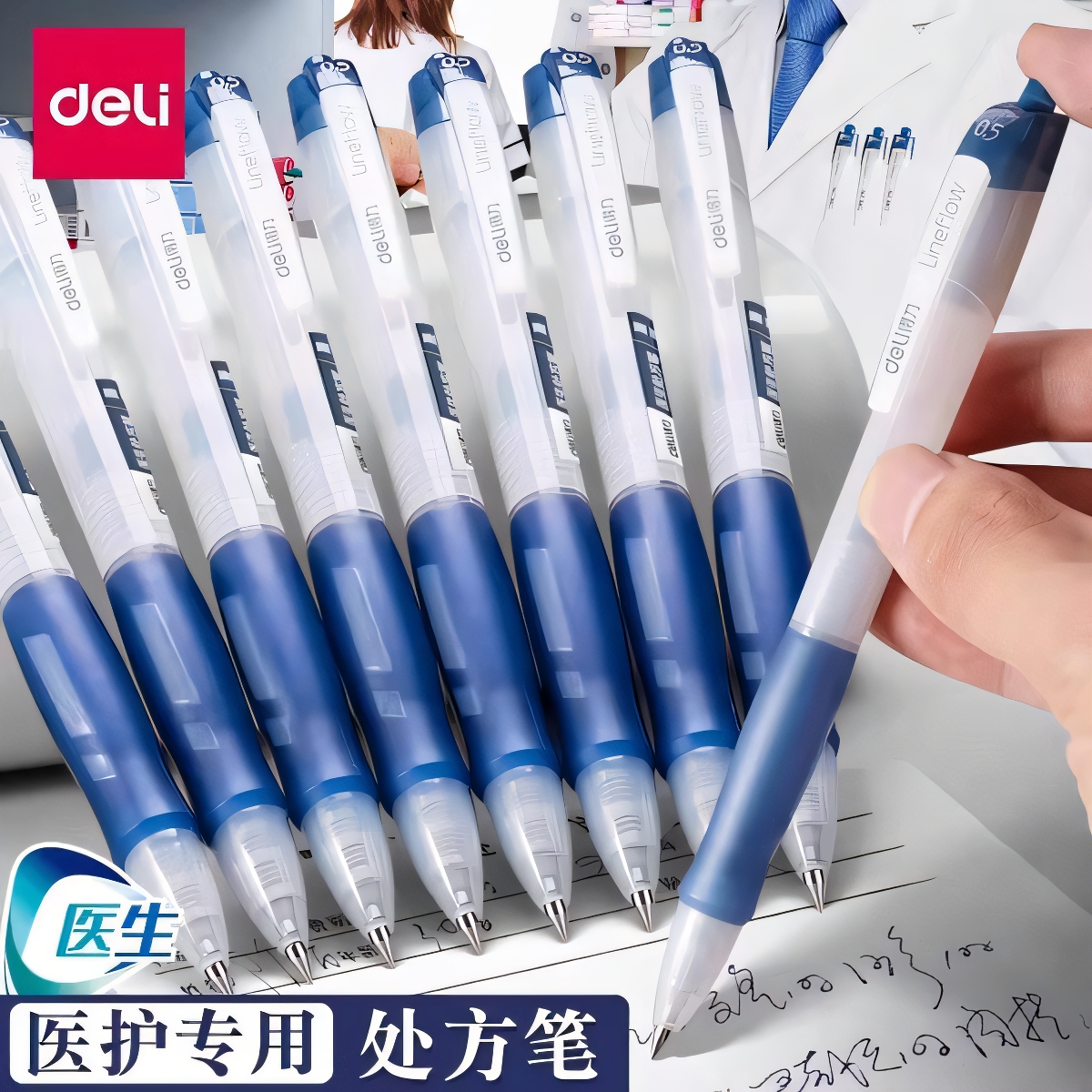 得力蓝黑色中性笔医护处方笔专用医生医用笔按动签字笔顺滑速干墨兰护