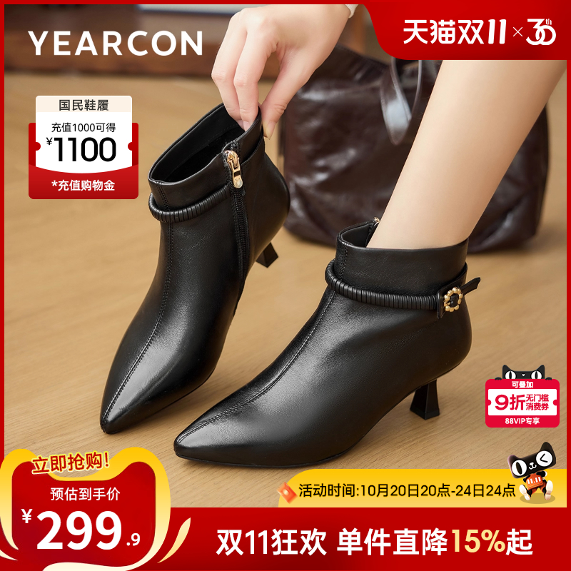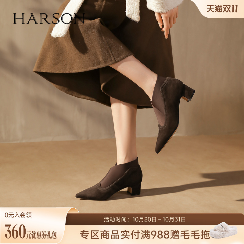 哈森尖头粗高跟深口皮鞋气质及踝靴女短靴2025冬新款HA2534