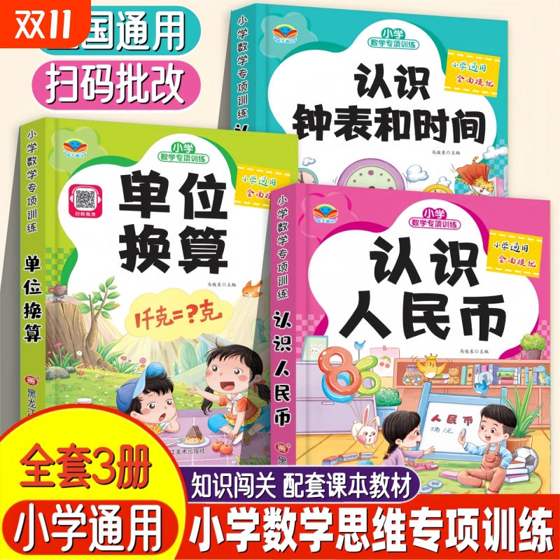 全3册认识人民币钟表和时间单位换算小学1-3年级数学专项训练幼小