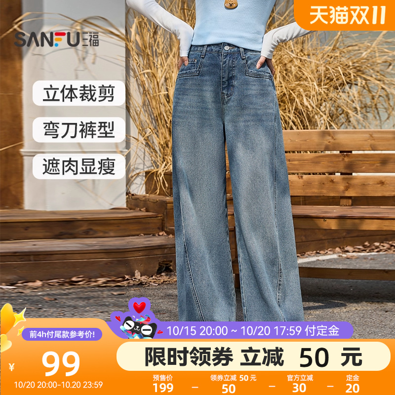 三福牛仔长裤2025年新款秋季时尚复古宽松直筒阔腿裤子女装504