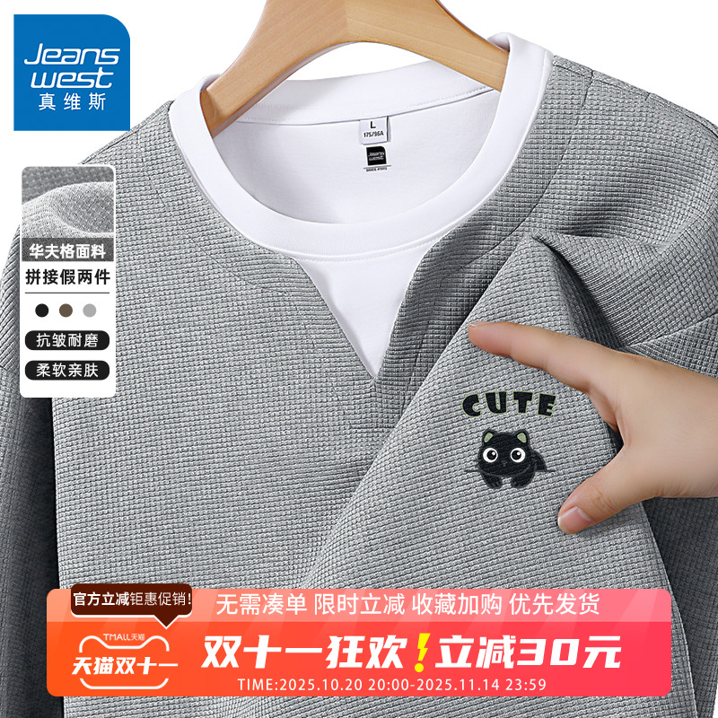 GV真维斯华夫格t恤男款长袖春秋男士打底衫青少年假两件休闲上衣B