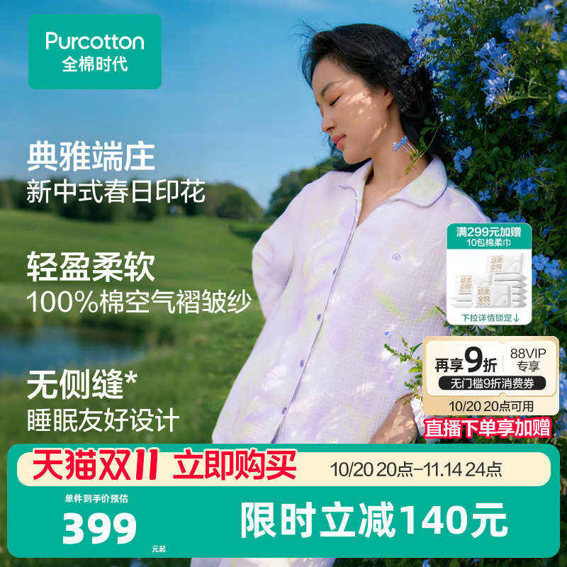 【双11现货】全棉时代女士睡衣空气褶皱纱棉纱家居服居家裙春秋新