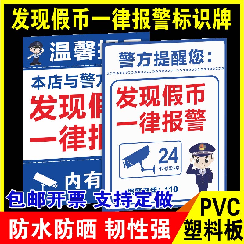 发现假币一律报警提示牌本店超市便利商场与警方联网使用直接没收立即