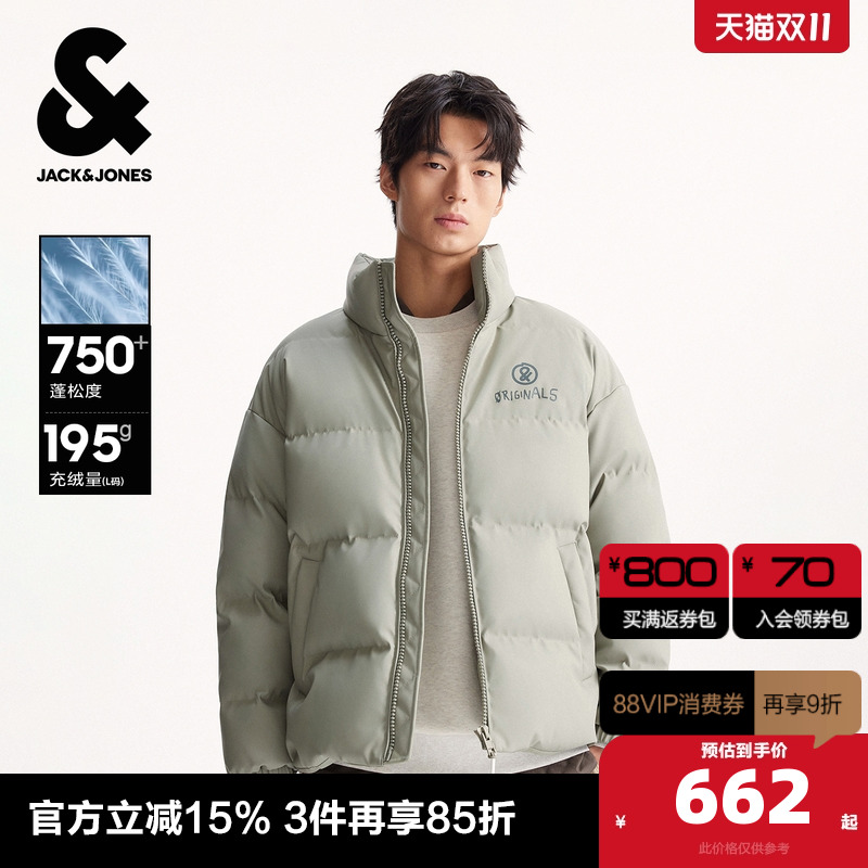 杰克琼斯男装羽绒服秋季新款钢压印花廓形休闲立领保暖外套上衣