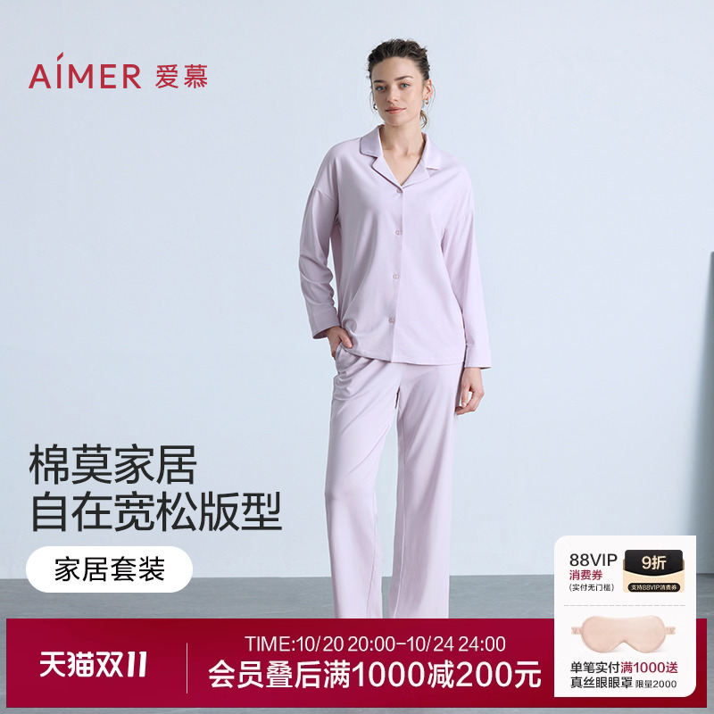 曼妮芬女生半开襟长袖长裤套装睡衣睡裤舒适家居服套装女士起居服