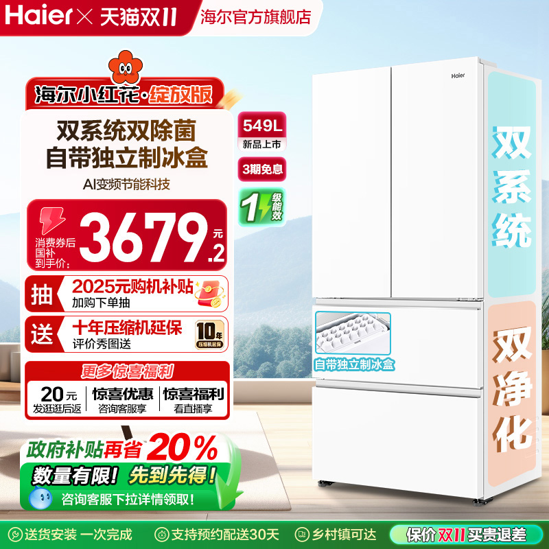 【双系统】海尔小红花549L法式多开门大容量制冰风冷无霜家用冰箱