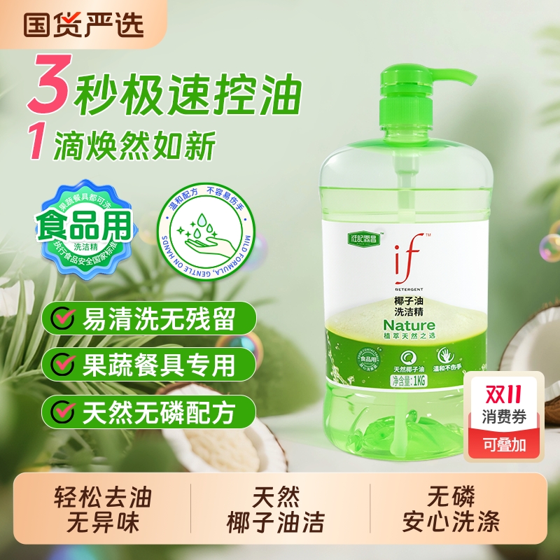 if天然椰子油洗洁精1kg×1瓶去油除味果蔬放心洗温和去污家用洗