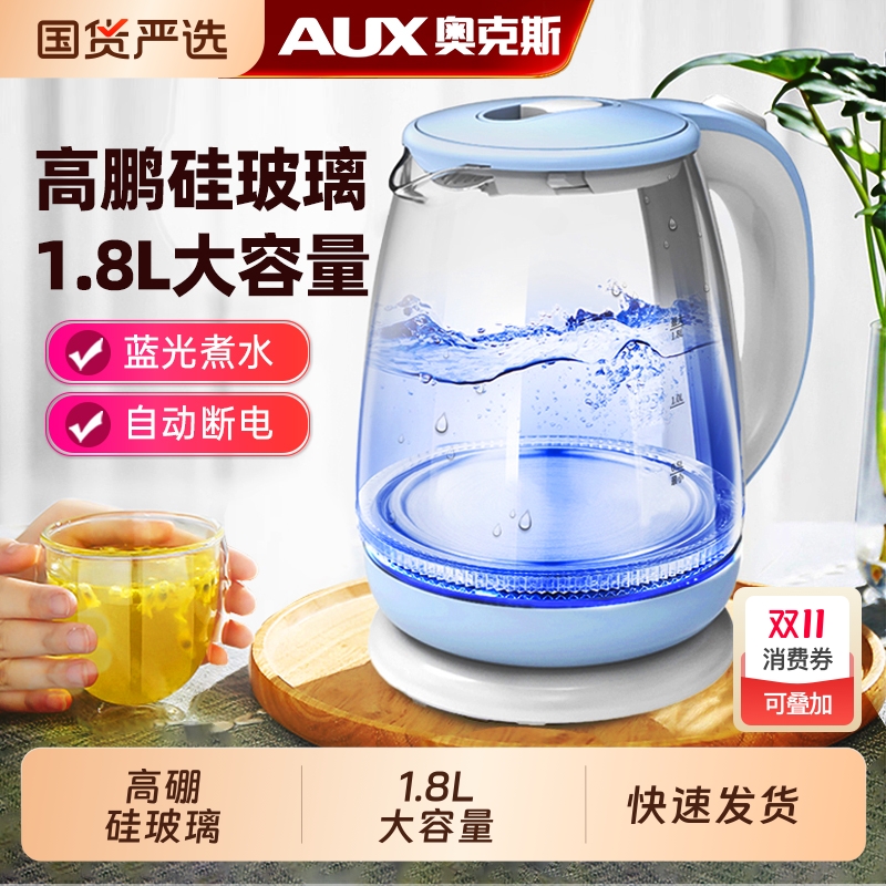 奥克斯电热水壶烧水壶家用高硼硅玻璃透明自动泡煮茶器耐高温蓝光