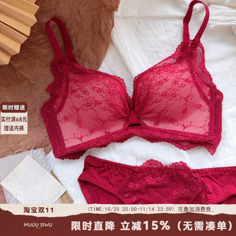 本命年性感红色内衣内裤套装女小胸聚拢无钢圈上薄下厚蕾丝文胸罩