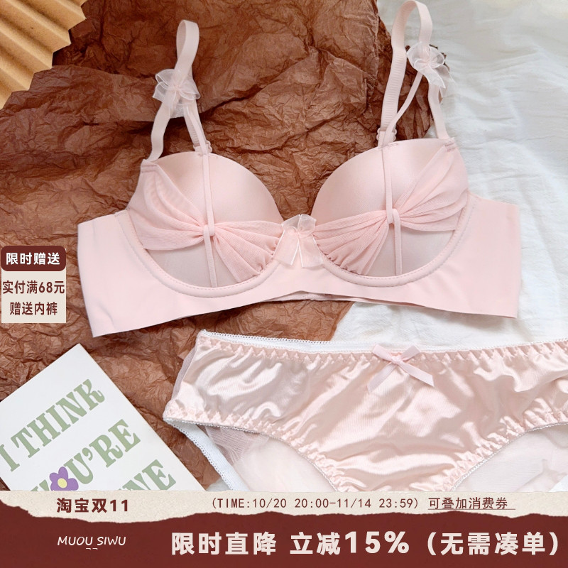 粉色网纱蝴蝶结内衣女无钢圈小胸聚拢半杯舒适性感纯欲文胸罩套装