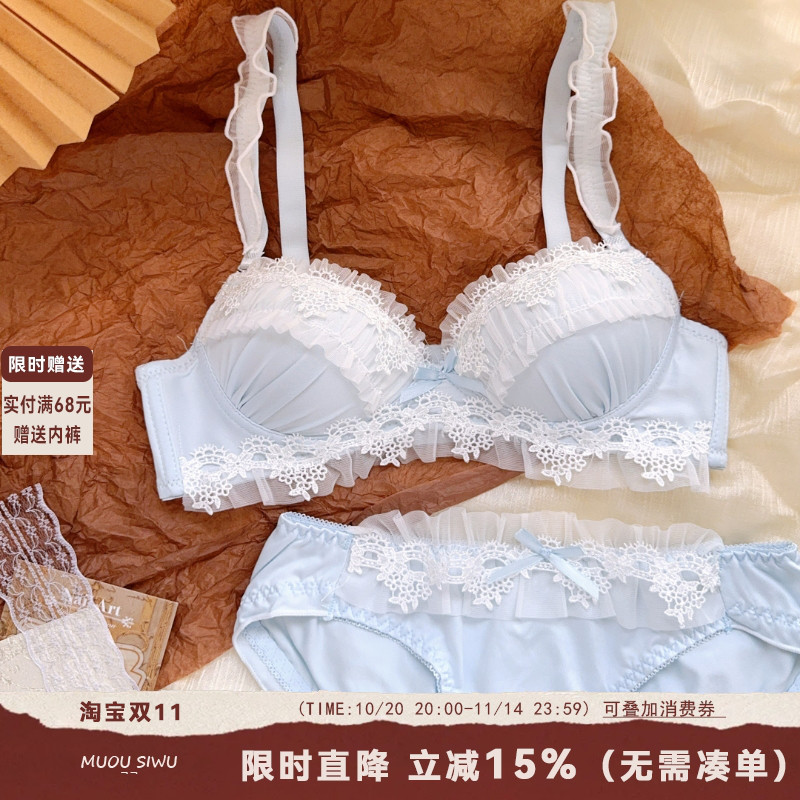 日系甜美可爱蕾丝内衣少女蓝色无钢圈小胸聚拢性感纯欲风文胸套装
