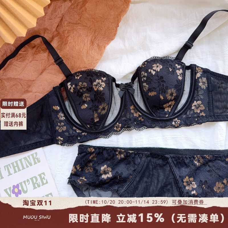 法式黑色性感蕾丝内衣女无钢圈大胸显小超薄款三角杯美背文胸套装