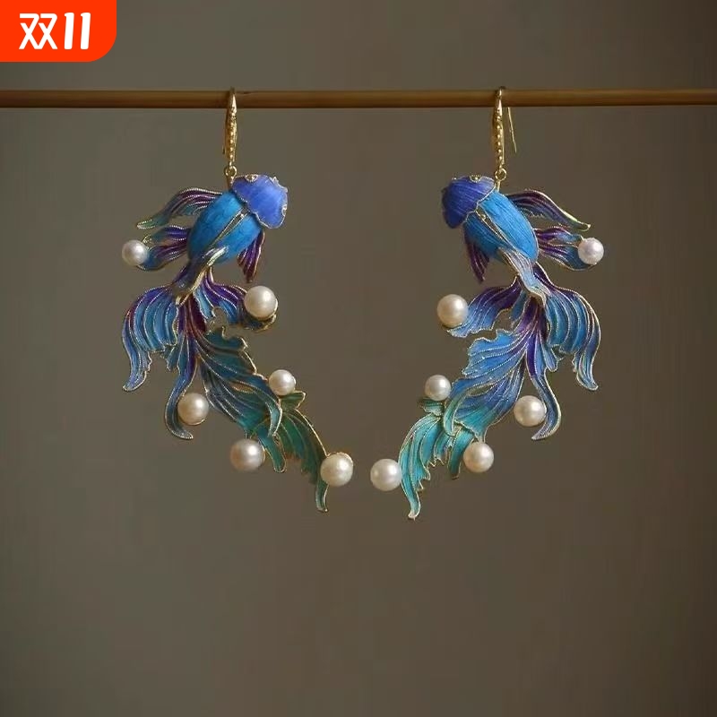 新中式复古蓝色锦鲤耳环女复古风小众设计汉服配饰高级感耳钩耳饰