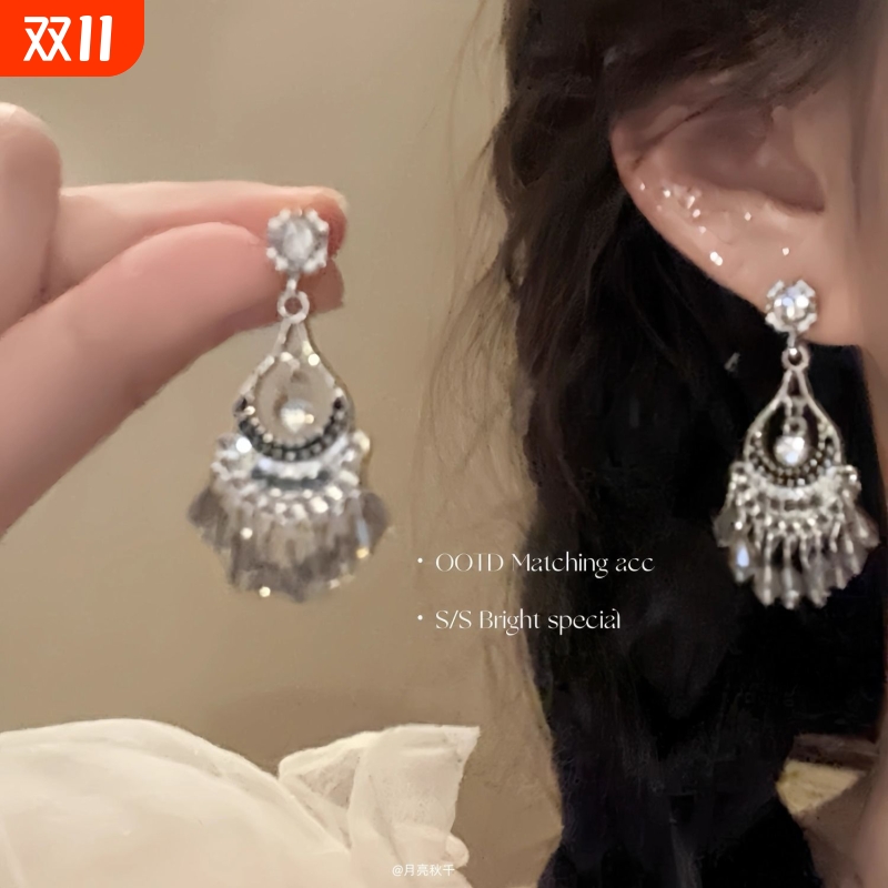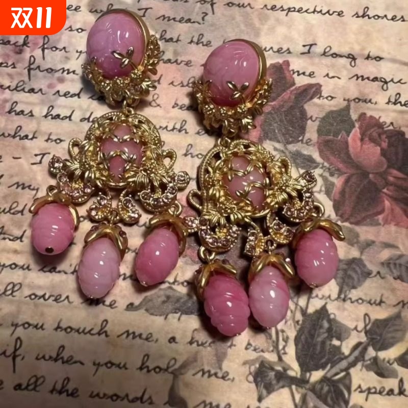 中古巴洛克宫廷风粉色蓝色串珠雕花镶钻耳环女复古流苏耳钉