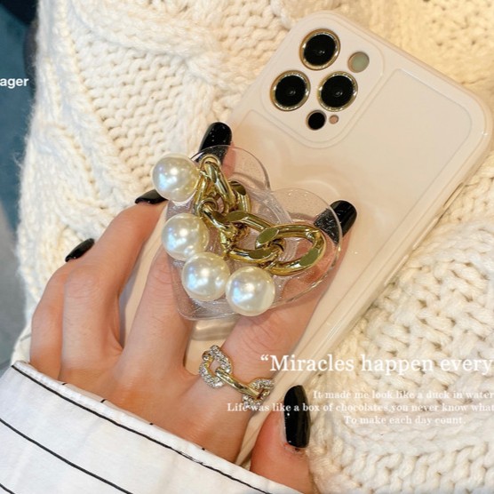 创意爱心透明金属链条珍珠手机气囊支架粘贴式ins高级感背贴桌面