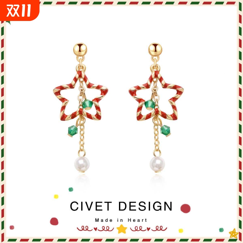 原创五角星流苏圣诞节耳环秋冬可爱甜美耳钉百搭气质无耳洞耳夹女