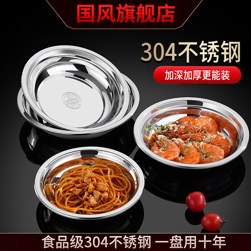 国风304不锈钢盘子家用特厚圆形装菜的圆盘碟子菜盘备菜深盘餐盘