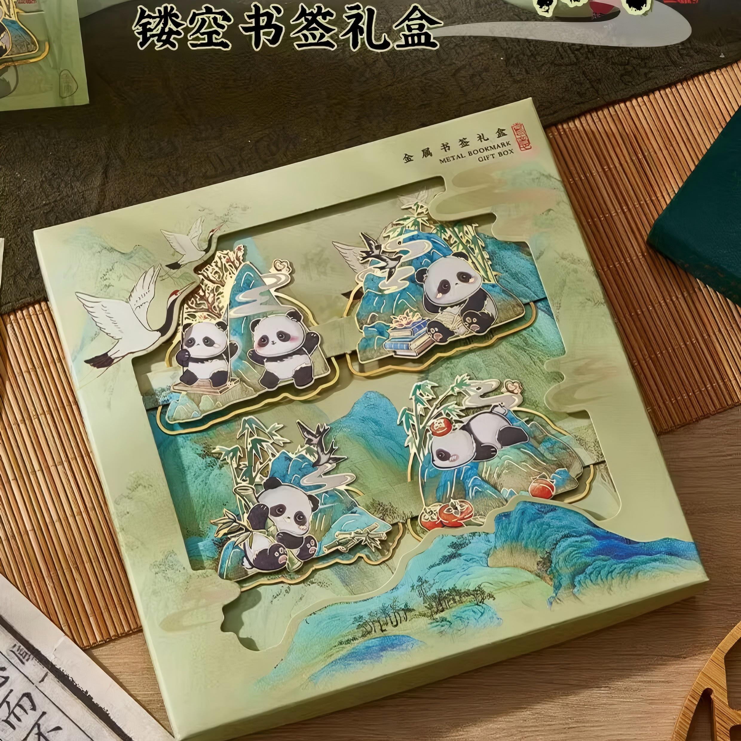 卡通水墨熊猫金属书签礼盒古典中国风文创镂空书签精致小学生奖励故宫