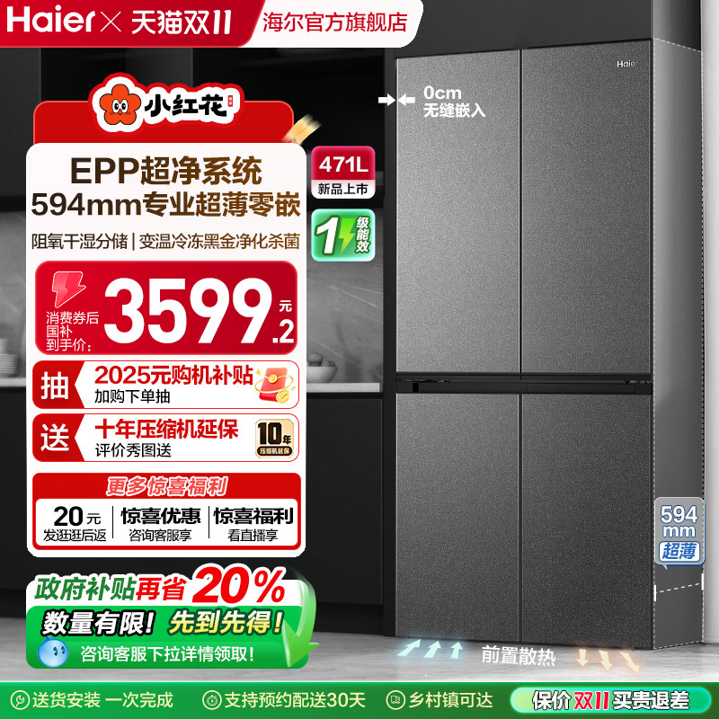 换新补贴海尔小红花500L十字双开四门一级超薄家用风冷无霜电冰箱