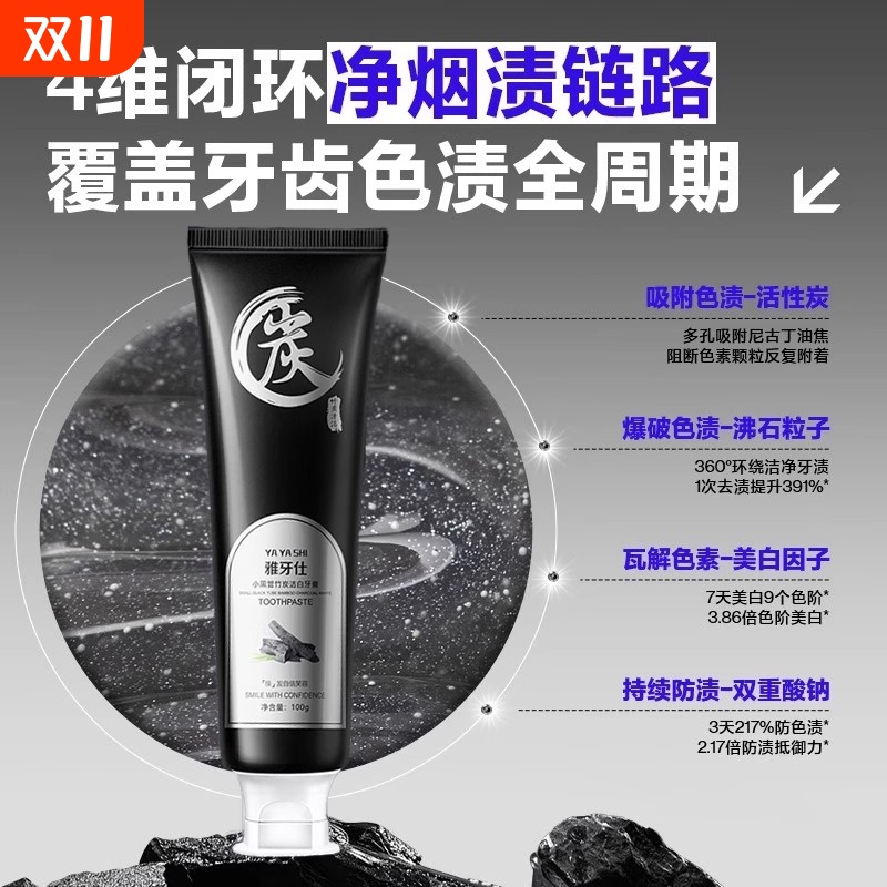小黑管竹炭洁白牙美白清火去黄去烟渍护龈清新薄荷味牙膏牙结石